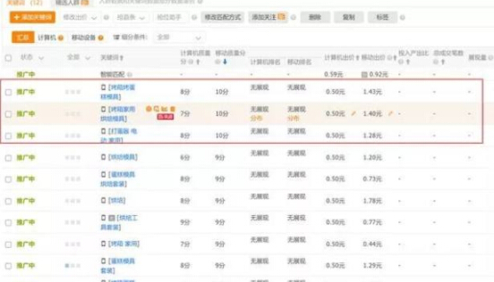 我们就把这些10分以下的关键词都删掉,然后继续推广几天。之后再添加关键词,你会发现之前没有10分的都涨到10分了。