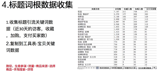 备选词库完成以后,开始收集标题的数据,修改标题首先需要知道关键词或者它的词根,之前的历史数据表现如何。这样也有一个更好的依据,进行筛选和替换,通过生意参谋—流量—商品来源—选择商品—手淘搜索—详情的路径,这里就可以看到标题关键词对应的数据表现,下载近30天的访客、收藏、加购、支付买家数的数据。把下载的内容复制到工具箱里的宝贝关键词数据中。