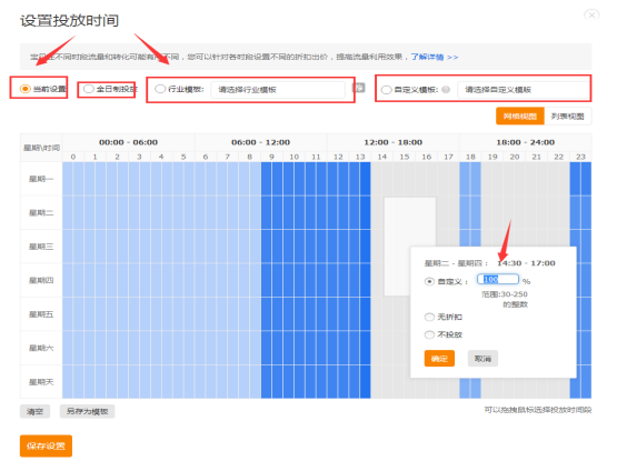 3.设置投放时间:设置投放时间折扣,可以统一对所有关键词出价影响,从而不用去调整每一个关键词的出价。实际出价等于当前出价*分时折扣。
