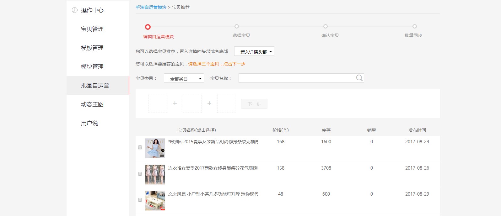 点击添加,选择置入详情头部,选择你想推荐的三款宝贝,下一步之后选择你想把这三款宝贝推荐到的宝贝详情页里。这样的话,在别的宝贝的详情页里就可以看到卖家推荐的这三款宝贝了。如下图所示,